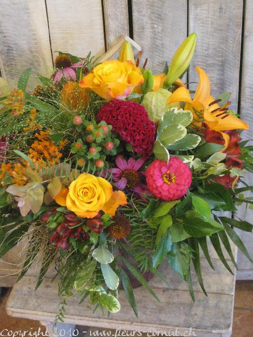 Ces assemblages délicats, réalisés avec fleurs et verdures, demandent de garder leur attache et d'être simplement déposés dans un beau vase d'eau propre.